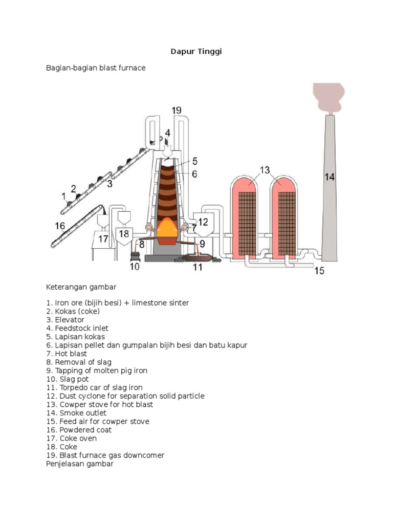 gambar dapur tinggi, proses dapur tinggi, tujuan proses pemanggangan di dalam oven sebelum dimasukkan ke dapur tinggi yaitu, konstruksi dapur tinggi, gambarkan dapur tinggi, daerah suhu dalam dapur tinggi, 3 daerah suhu dalam dapur tinggi, gambar dapur tinggi pengolahan bijih besi,